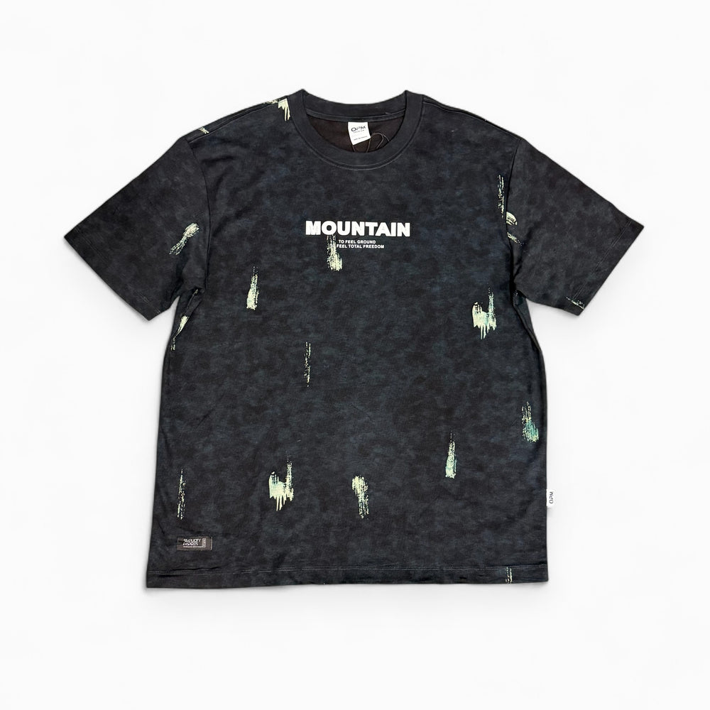 Atrévete a destacar con esta camiseta Mountain, diseñada para hombres que buscan estilo y autenticidad en cada detalle. Su base en tono negro desgastado con efecto tie-dye se complementa con toques gráficos en tonos verdes que evocan un look urbano y moderno. En el pecho resalta el estampado tipográfico MOUNTAIN que transmite fuerza y libertad.