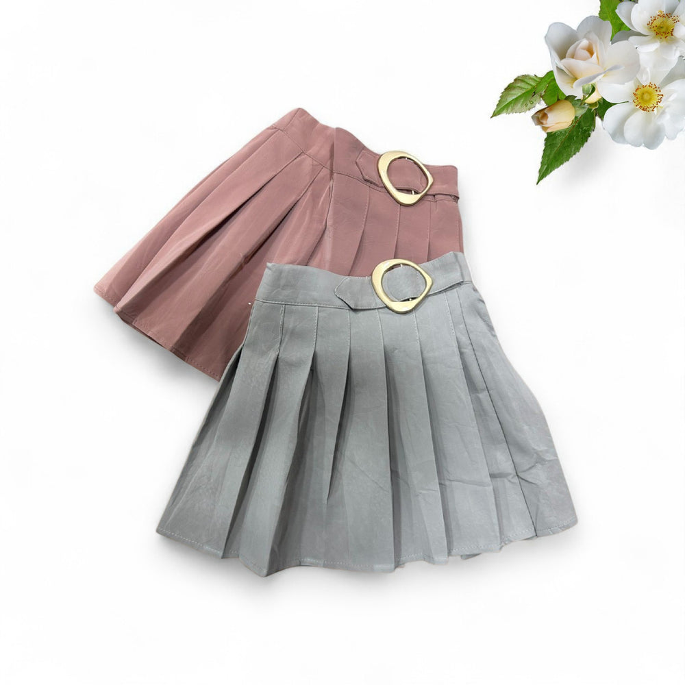 La falda Ariana en tono gris claro es una prenda versátil que combina estilo y comodidad. Su diseño plisado con detalle de hebilla decorativa en la pretina le da un toque moderno y sofisticado, ideal para que tu hija luzca con encanto en cualquier momento del día.