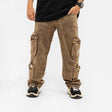 Estilo cargo con actitud urbana. Este jean rígido destaca por su acabado desgastado en tono marrón y múltiples bolsillos funcionales con solapa y detalles estampados, que aportan practicidad y un look moderno.