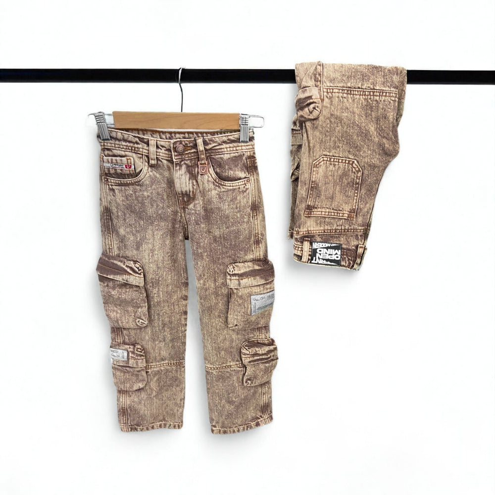 Este jean rígido estilo cargo con múltiples bolsillos ofrece practicidad y un look moderno para los niños que siempre están en movimiento. Su diseño en tono desgastado aporta un aire urbano y versátil, ideal para combinar con camisetas básicas y tenis en cualquier ocasión.