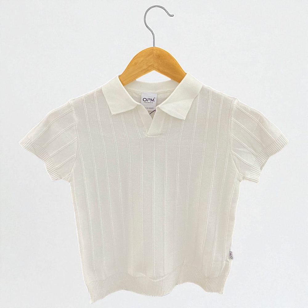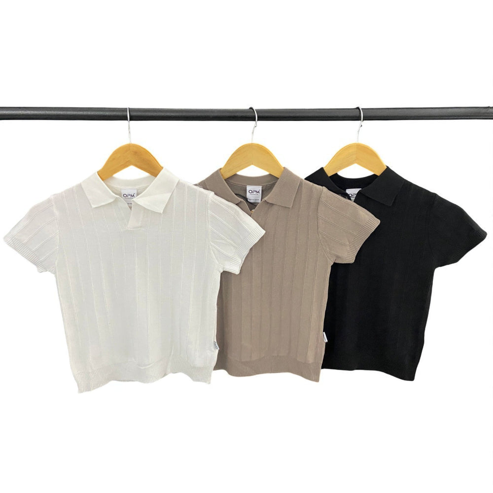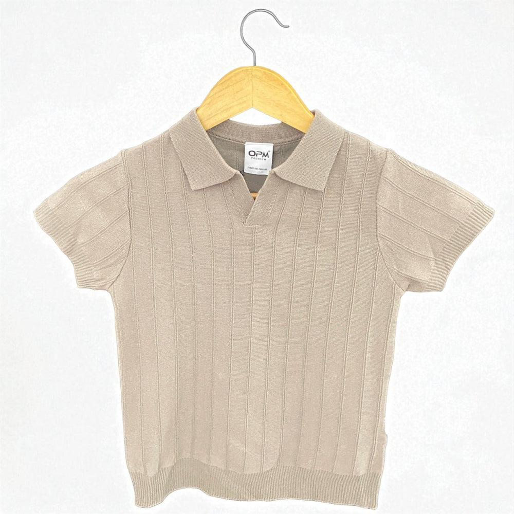 Su diseño tejido con canalé vertical, cuello tipo polo y abertura frontal le da un estilo moderno y sofisticado, ideal tanto para el uso diario como para ocasiones especiales. La tela es suave, fresca y elástica, pensada para niños activos que necesitan moverse sin restricciones.