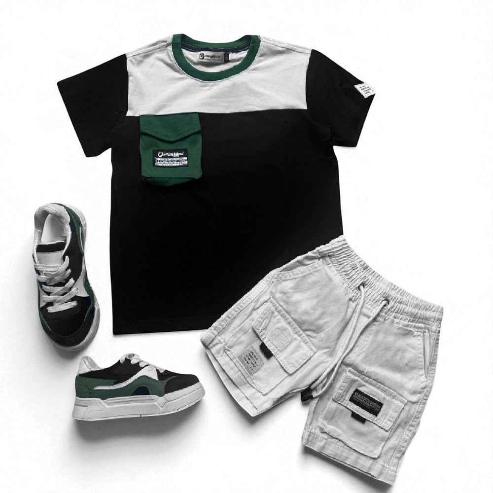 Una prenda pensada para madres prácticas que quieren que sus hijos estén cómodos, frescos y a la moda en cualquier ocasión. Esta camiseta combina colores modernos en negro, blanco y verde, con un bolsillo frontal funcional y decorativo, que le da un toque diferente y divertido.