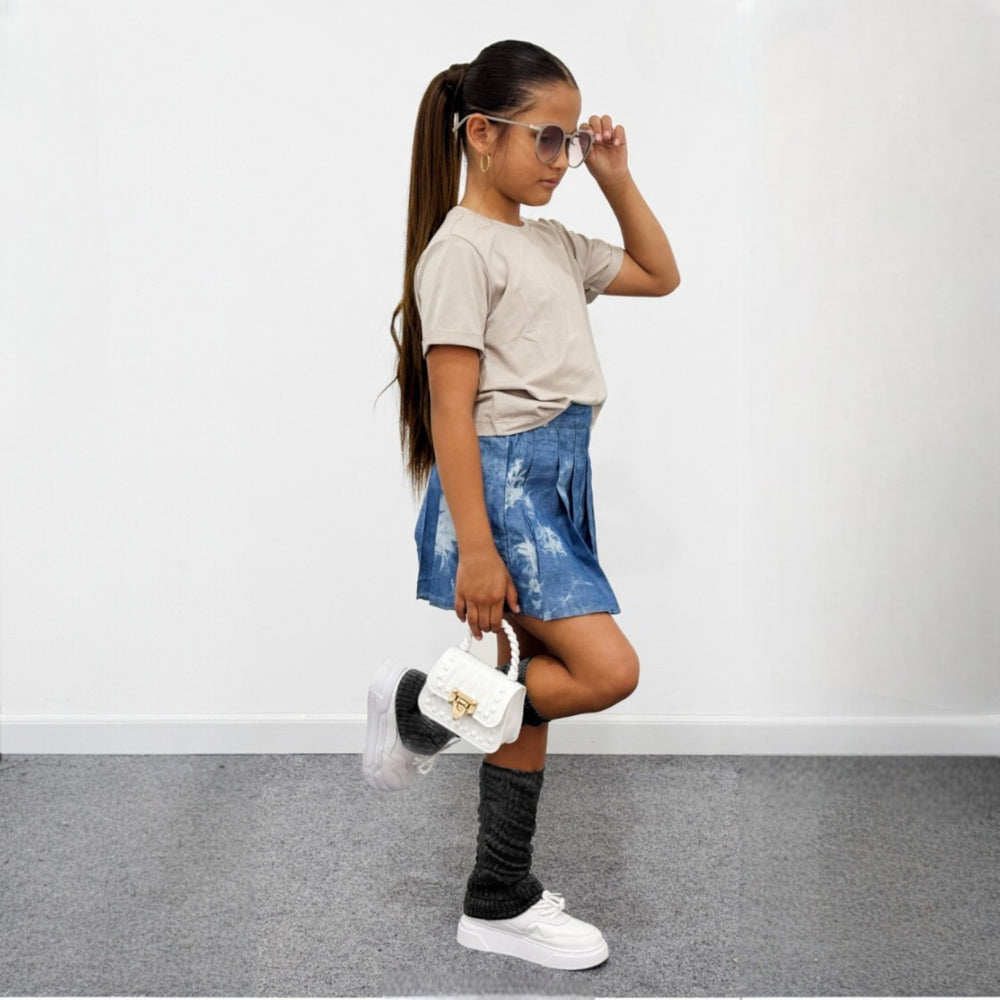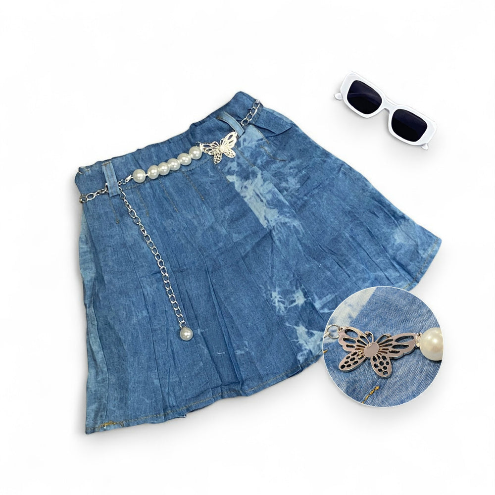 Esta falda en azul con efecto marmolado es una prenda que combina estilo y practicidad. Su diseño plisado le da movimiento y frescura, mientras que los detalles modernos como el cinturón de cadena con perlas y dije de mariposa aportan un toque divertido y sofisticado que encanta a las niñas.