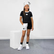 Este conjunto está pensado para acompañar a las niñas en su día a día con frescura y estilo. Incluye una camiseta corta en tono negro con ribetes en contraste, moderna y ligera, combinada con un short bicolor enresortado a la cintura, que garantiza comodidad y libertad de movimiento. El diseño práctico y actual lo convierte en un outfit versátil, perfecto para climas cálidos, juegos o salidas casuales.