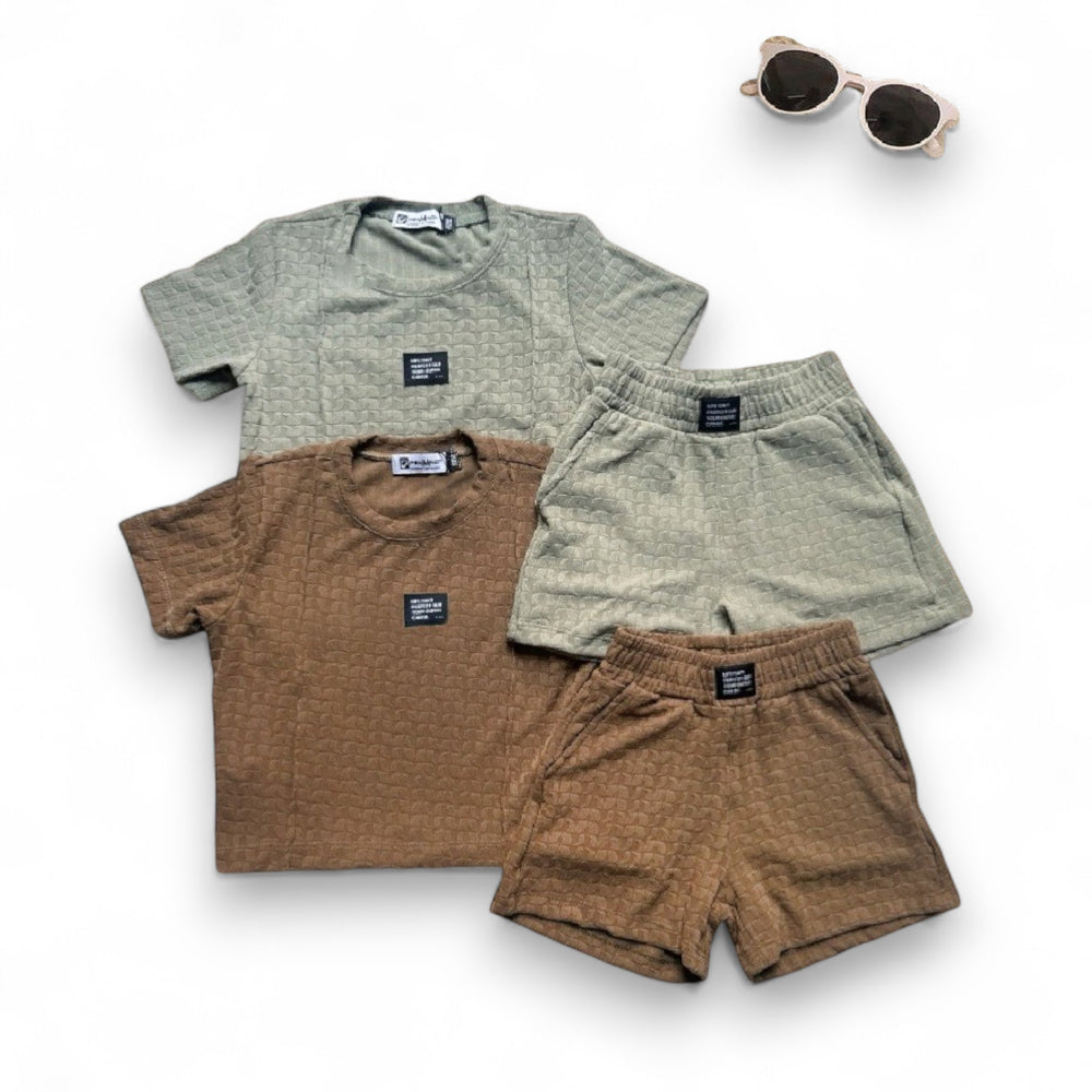 • Incluye camiseta manga corta y short en tela fresca con textura tipo panal, suave al tacto y resistente para el uso diario.