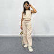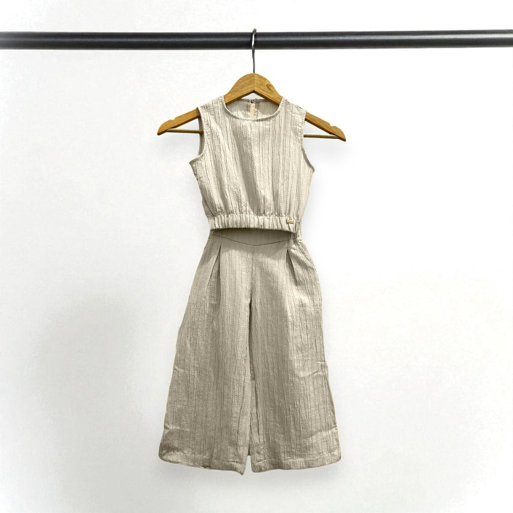 Un conjunto moderno y sofisticado diseñado para que las niñas se sientan cómodas y con estilo en cualquier ocasión. Incluye un crop top sin mangas en tono beige con pretina elástica, ligero y fresco, combinado con un pantalón recto de tiro alto con pliegues frontales, que aporta un aire elegante y al mismo tiempo práctico.