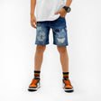 Esta bermuda kristof azul medio con detalles rotos y efecto desgastado combina comodidad, durabilidad y un look moderno, perfecta para acompañar a los niños en su día a día, desde el parque hasta una salida familiar.