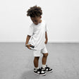 Incluye una camiseta liviana con textura en relieve y un short tipo jogger con pretina elástica y cordón ajustable, perfecto para acompañar a los niños en su día a día, dándoles libertad de movimiento y frescura.