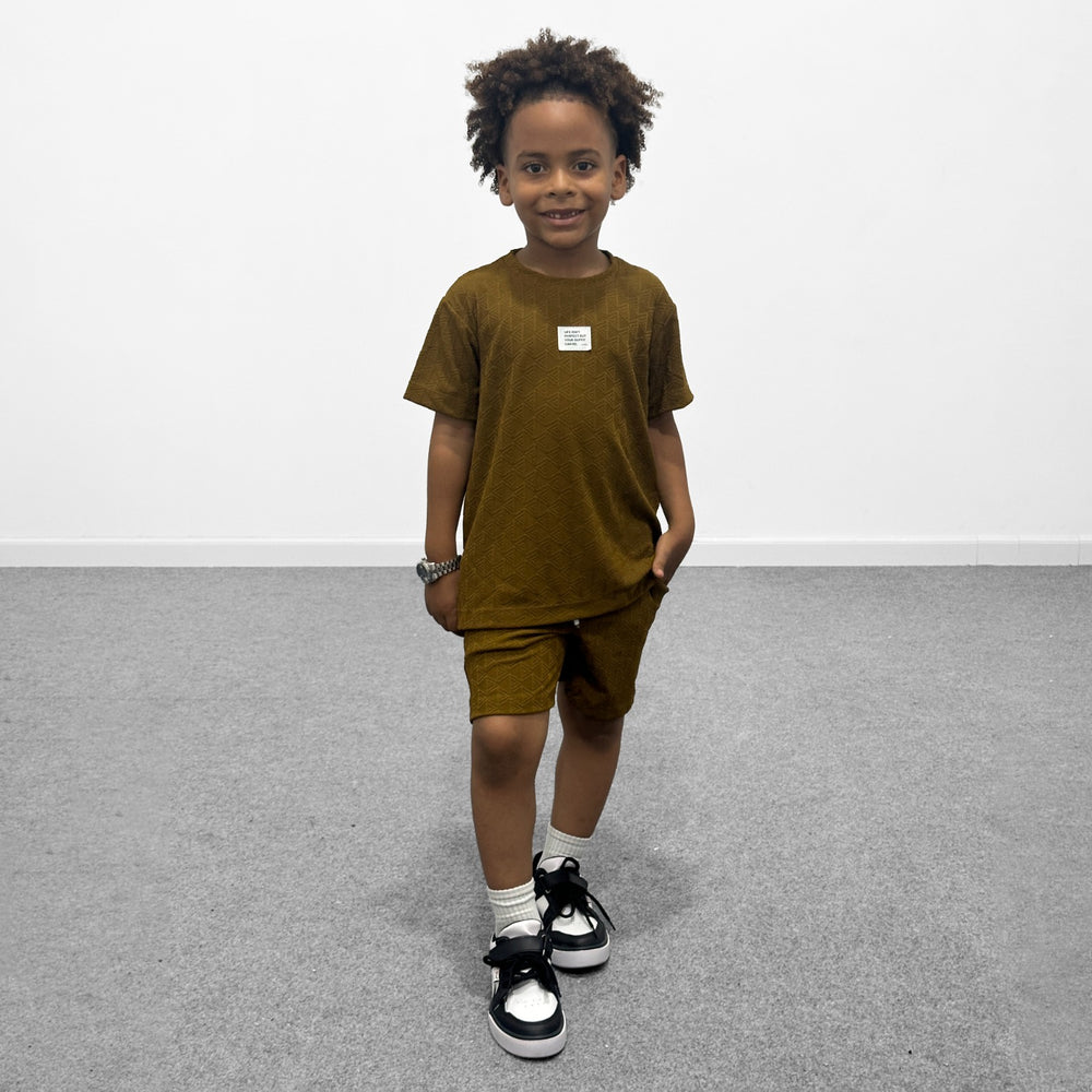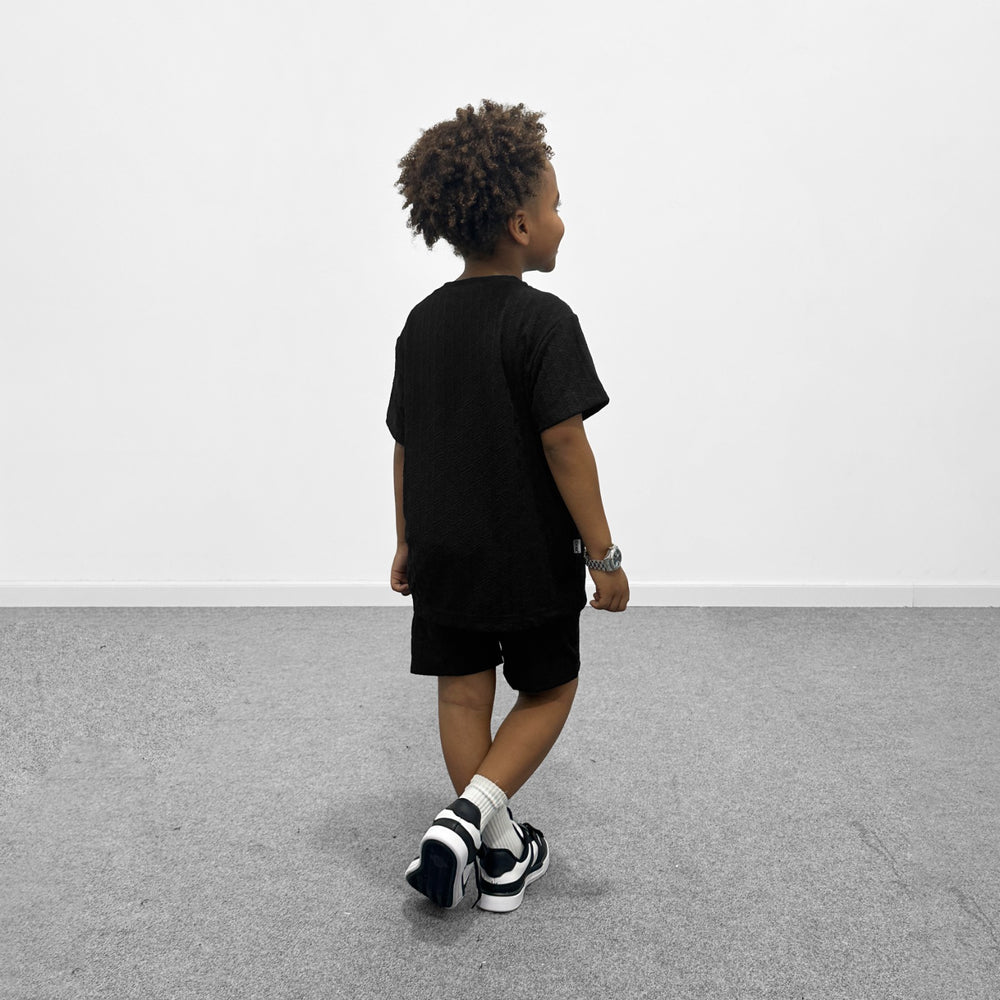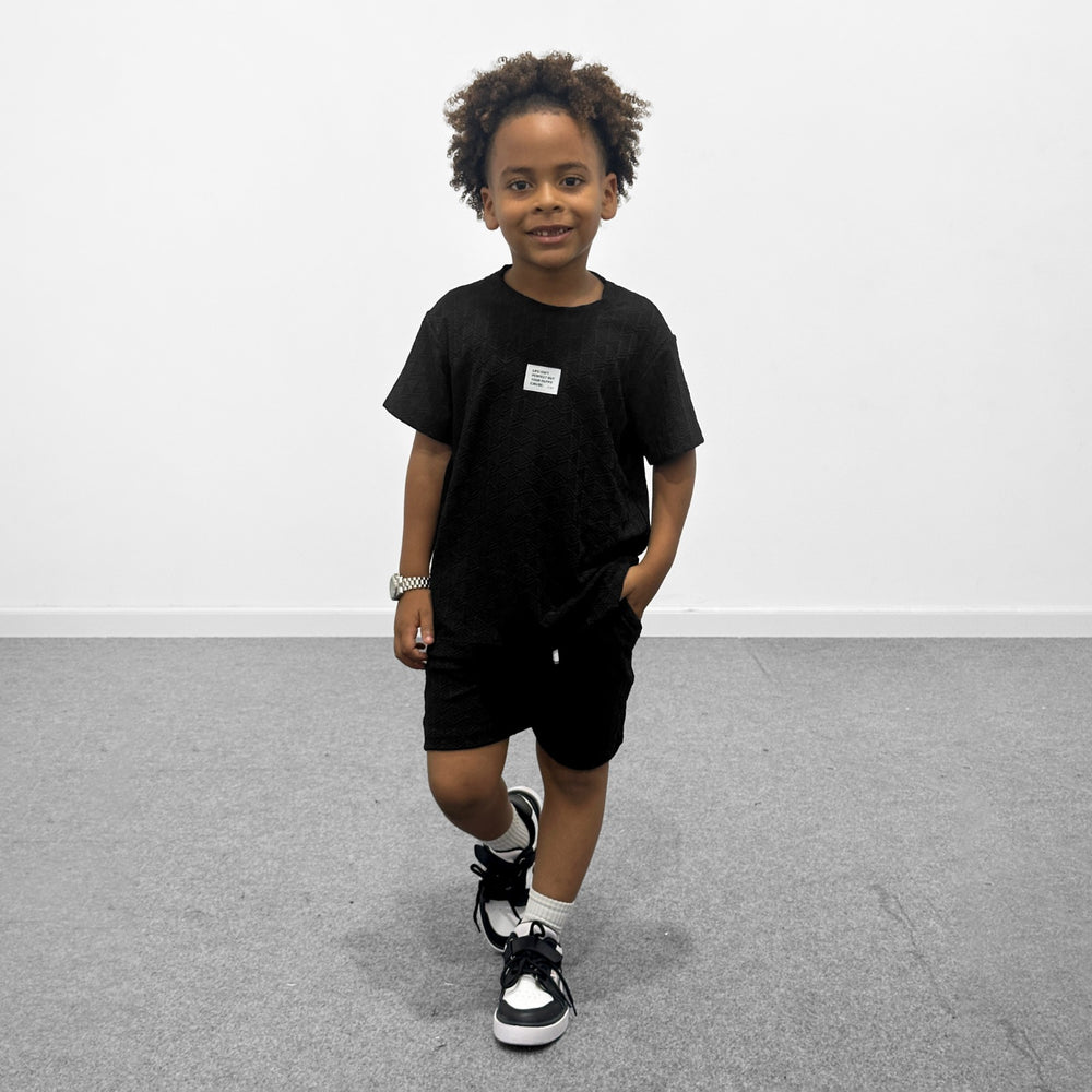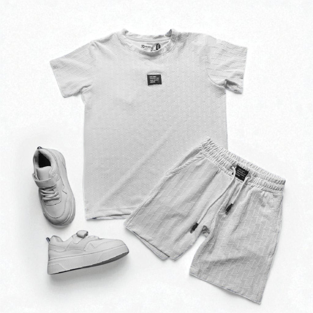 Este conjunto incluye una camiseta fresca de textura en relieve y un short tipo jogger con pretina elástica y cordón ajustable, ideal para acompañar a los niños en juegos, paseos o salidas casuales.