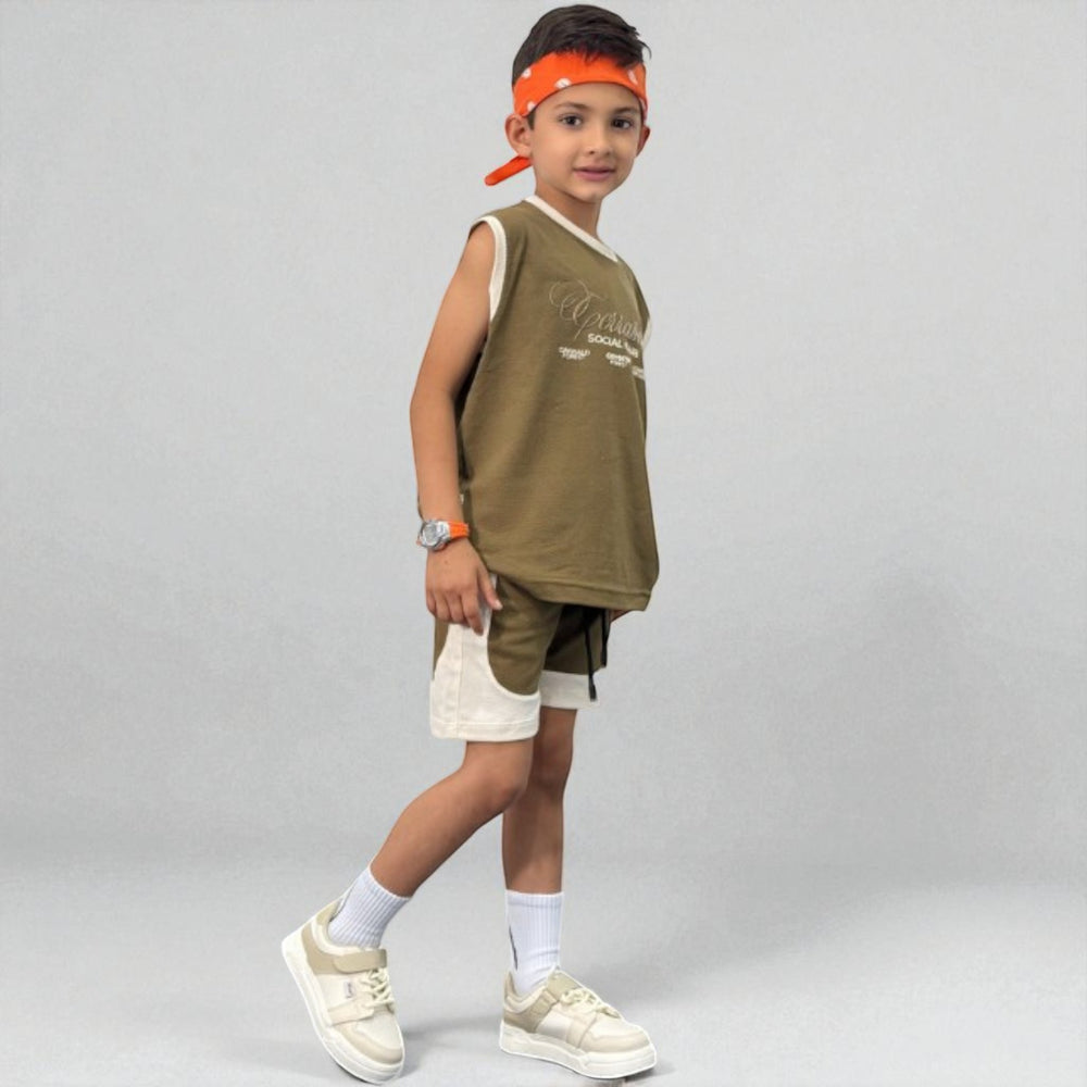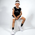 Este conjunto está pensado para las madres prácticas en Colombia que buscan vestir a sus hijos con estilo y comodidad sin complicarse. Incluye camiseta sin mangas en color negro con detalles en contraste y estampado al frente, combinada con shorts blancos de pretina enresortada que brindan libertad de movimiento.