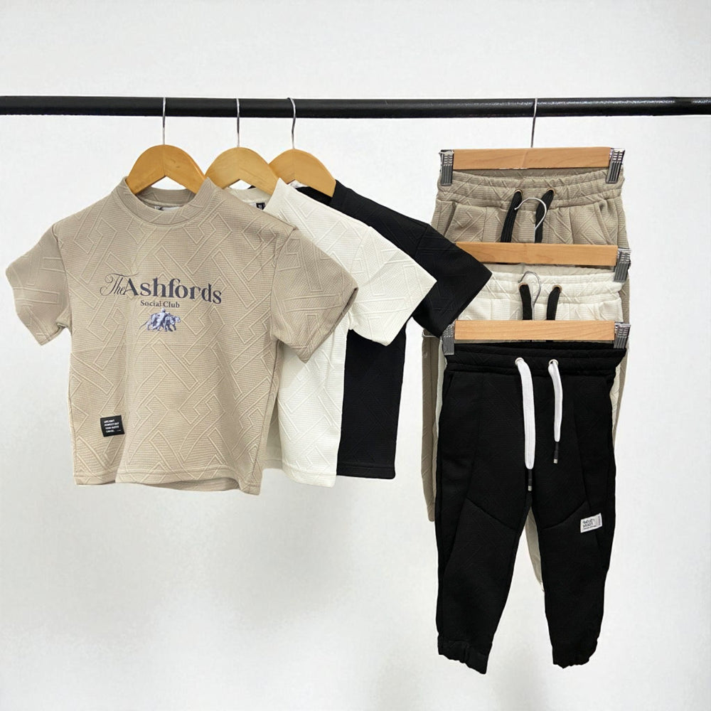Este set está pensado para las mamás prácticas de Colombia que buscan funcionalidad, buen gusto y facilidad a la hora de vestir a sus hijos. El conjunto incluye camiseta manga corta con textura geométrica y pantalón jogger con cordón ajustable y bota enresortada.