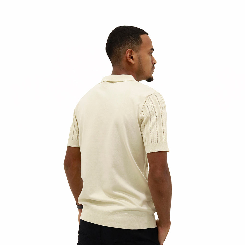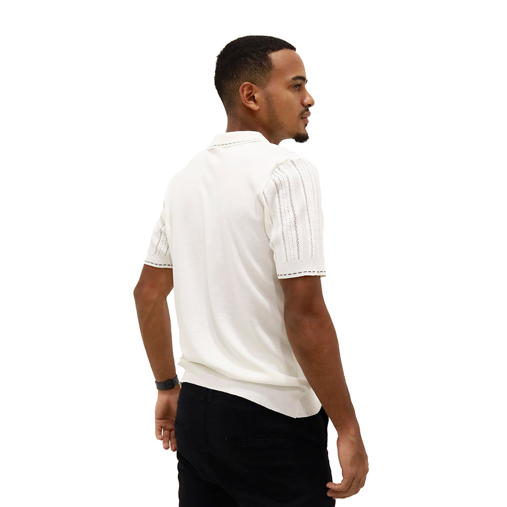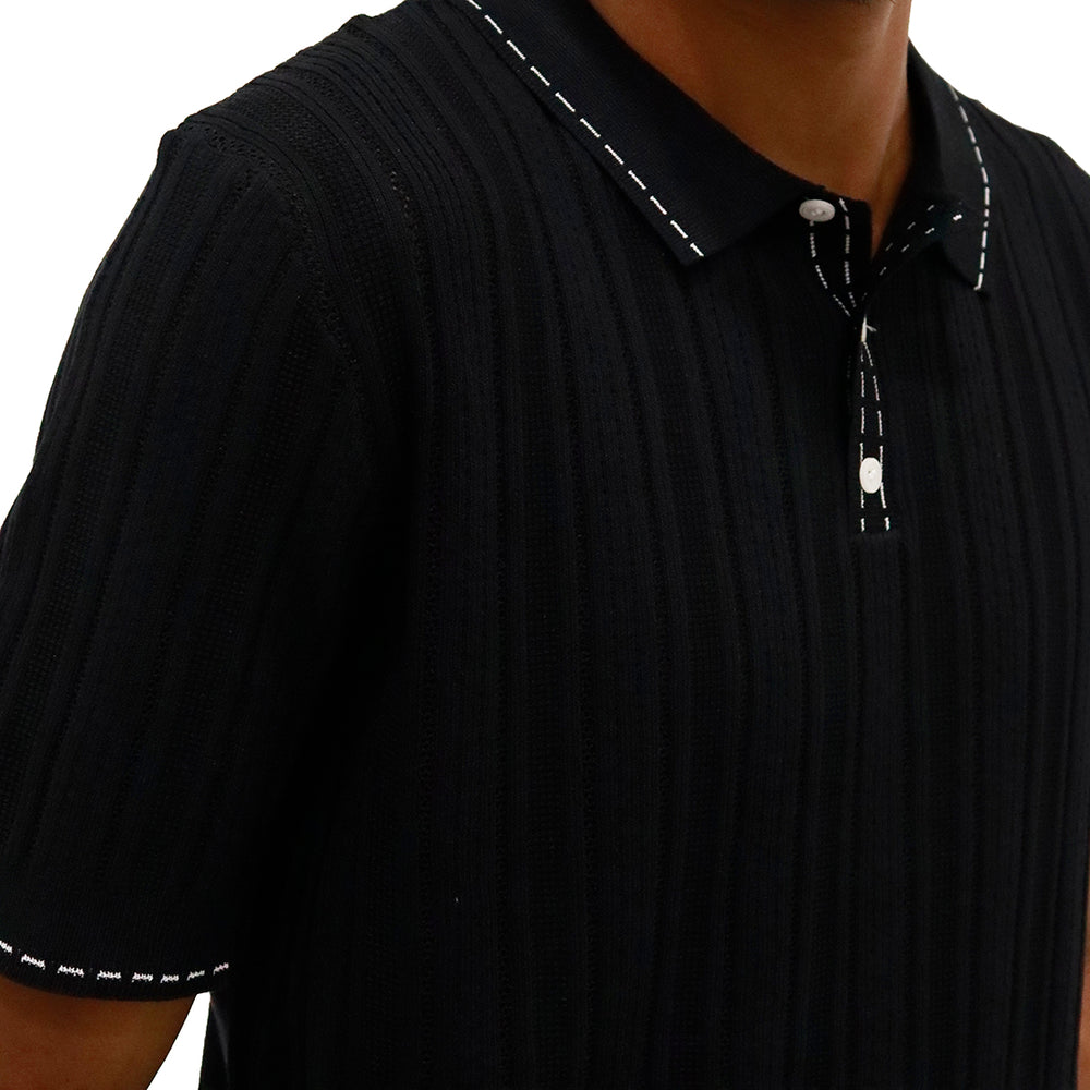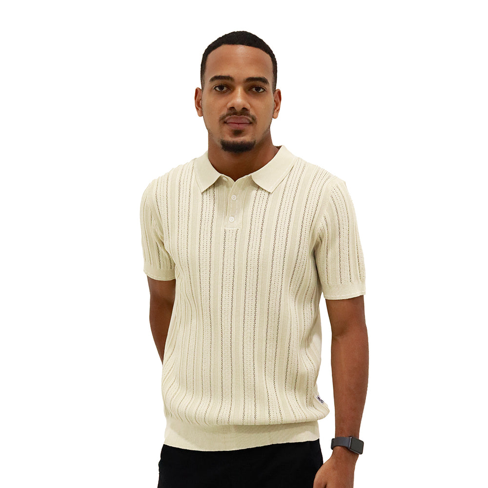 Prenda elaborada en tejido liviano con diseño calado y acanalado en líneas verticales que aportan textura y frescura. Cuello tipo polo con tapeta de botones que brinda un acabado clásico y elegante. Manga corta con terminación limpia para mayor comodidad y mejor ajuste.