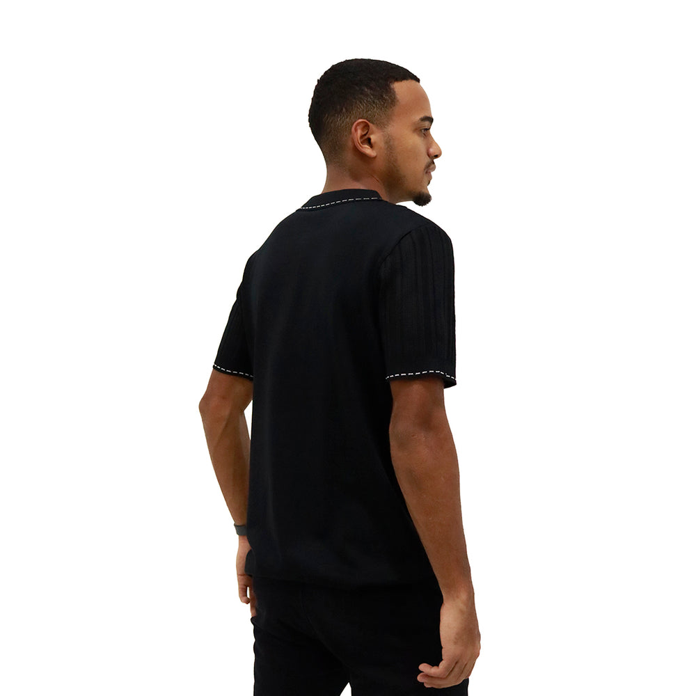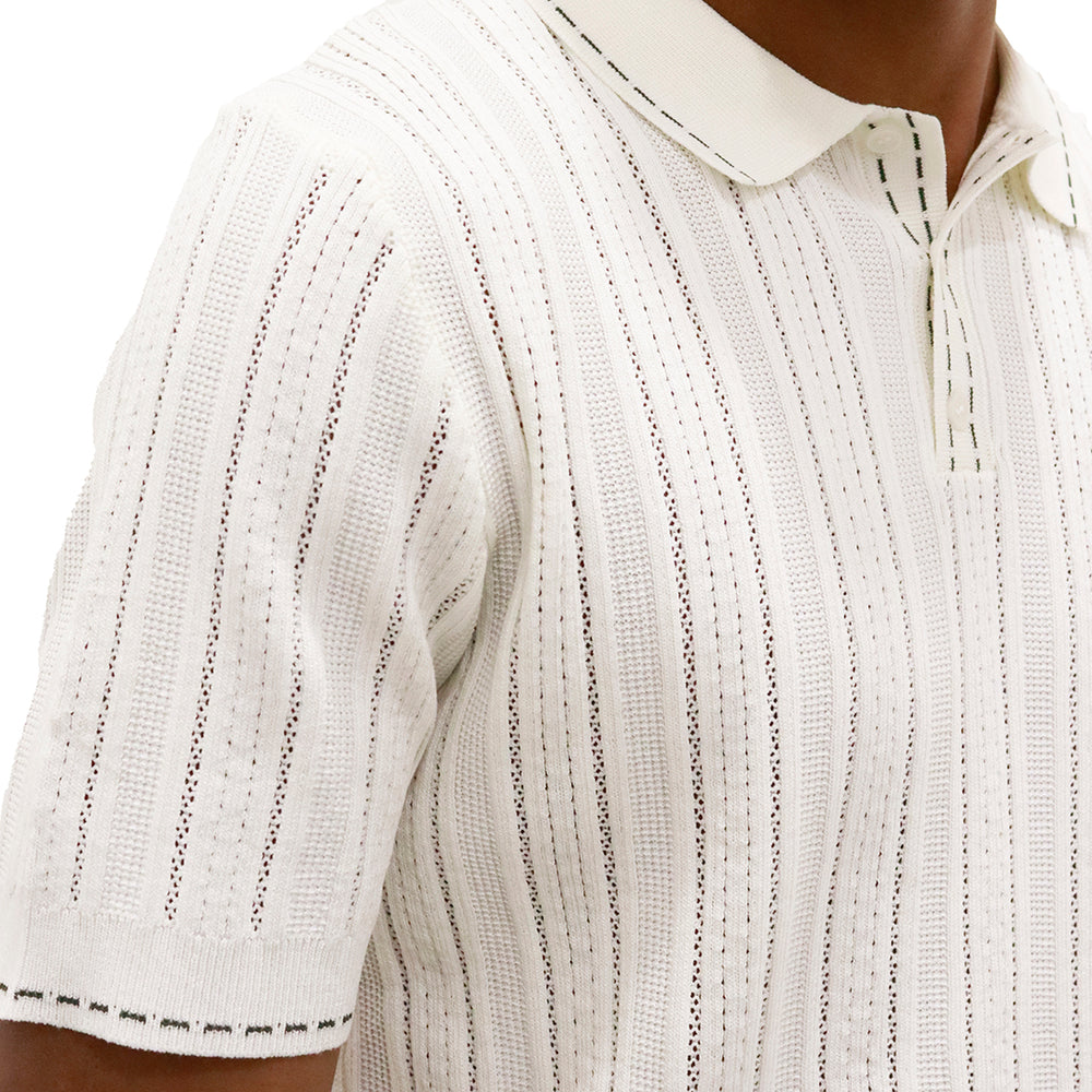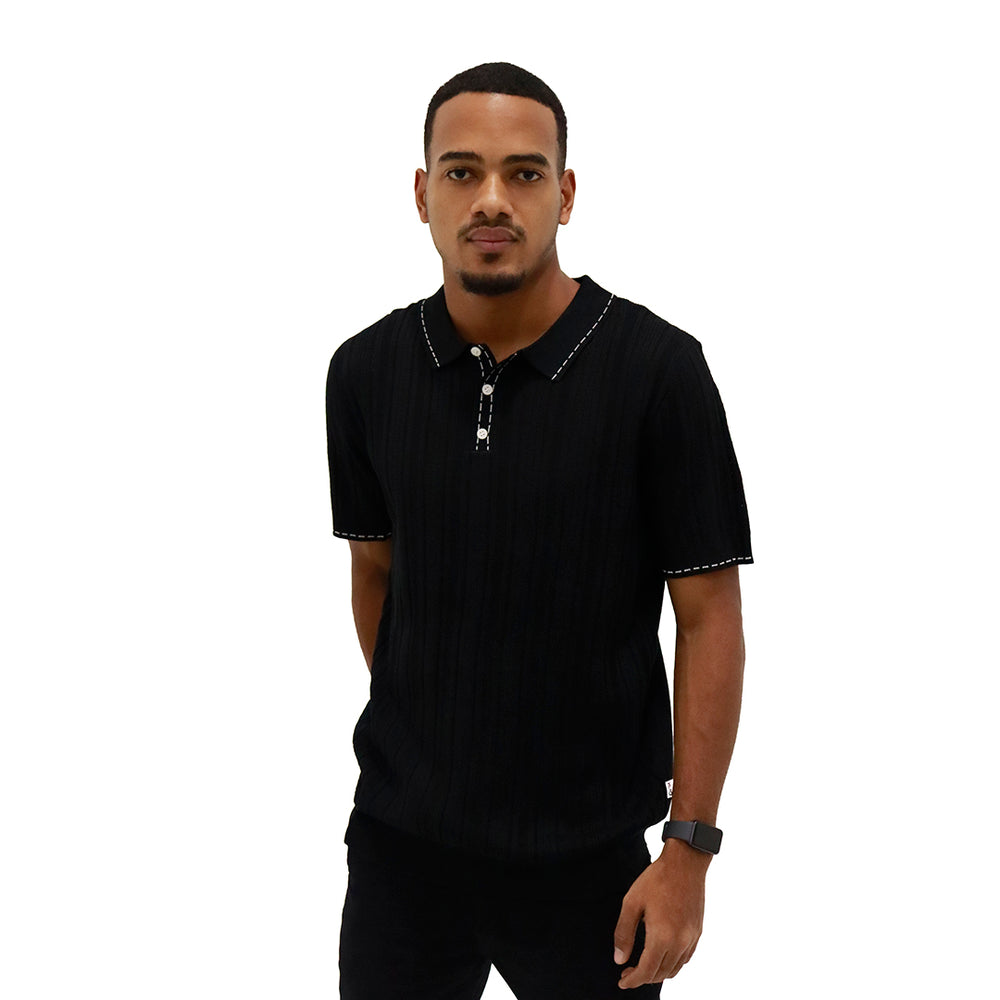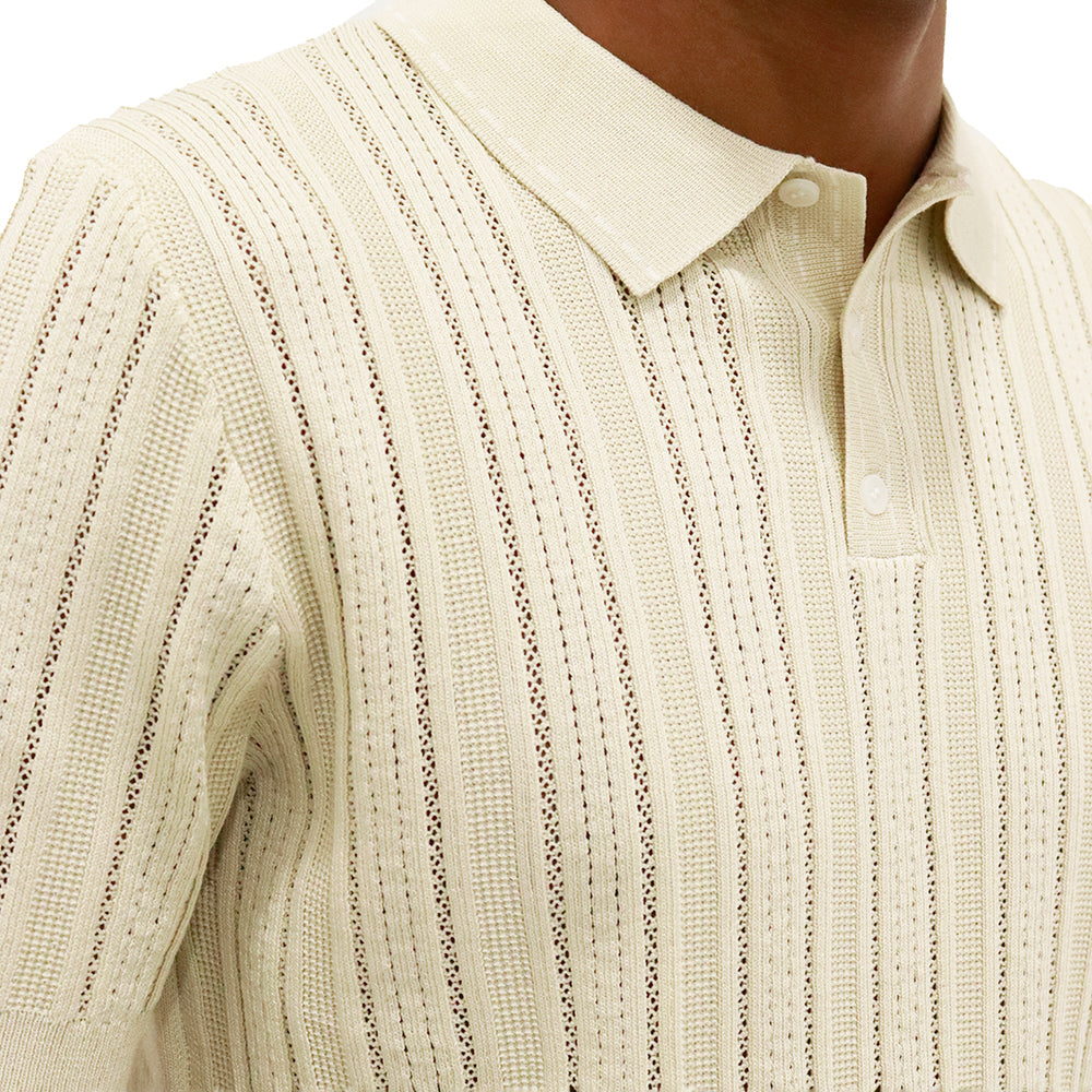 Prenda elaborada en tejido liviano con diseño calado y acanalado en líneas verticales que aportan textura y frescura. Cuello tipo polo con tapeta de botones que brinda un acabado clásico y elegante. Manga corta con terminación limpia para mayor comodidad y mejor ajuste.