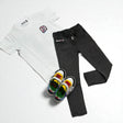 Un look práctico y moderno pensado para el día a día. Incluye una camiseta blanca clásica con estampado pequeño en el pecho y en la espalda, ideal para combinar con todo, junto a un pantalón tipo jean en color negro, cómodo y resistente, que aportan energía, diversión y un toque urbano al conjunto.