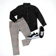Este outfit es ideal para que los niños luzcan elegantes sin perder comodidad. Incluye una camisa manga larga en color negro, con botones al frente que aportan sobriedad y estilo clásico, combinada con un pantalón slim fit a cuadros en blanco, negro y rojo, perfecto para darle un aire moderno y sofisticado, que equilibran el look con frescura y practicidad.